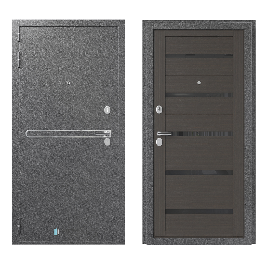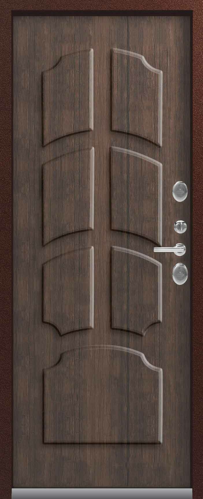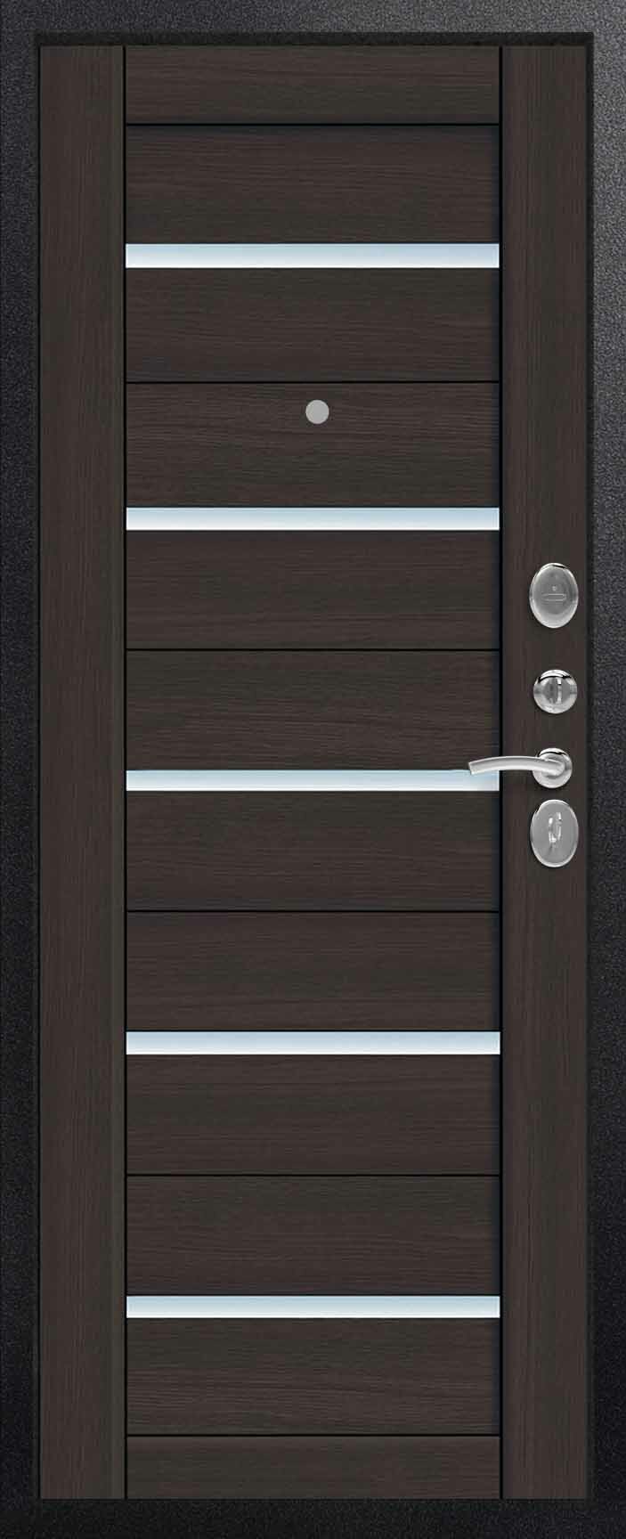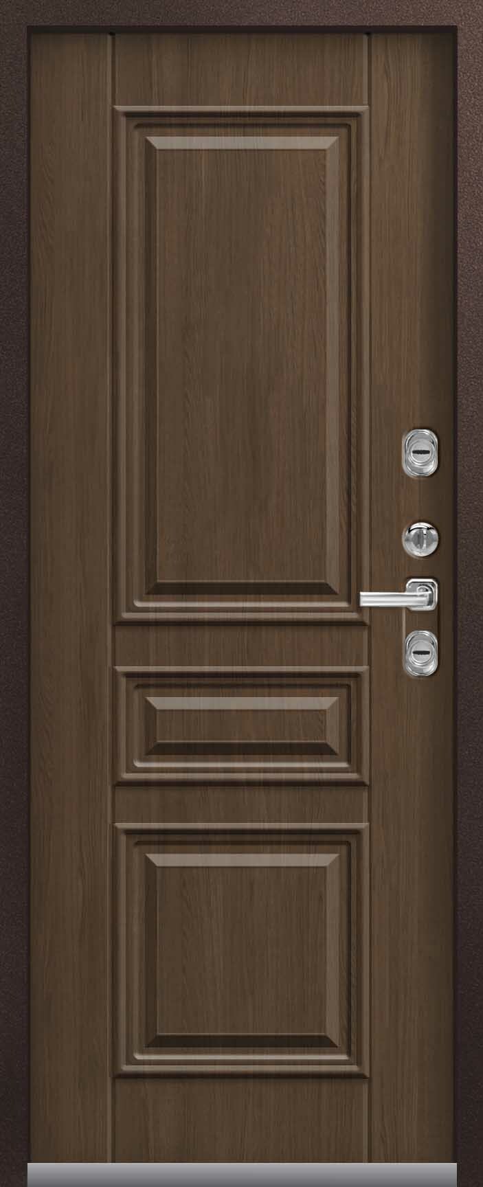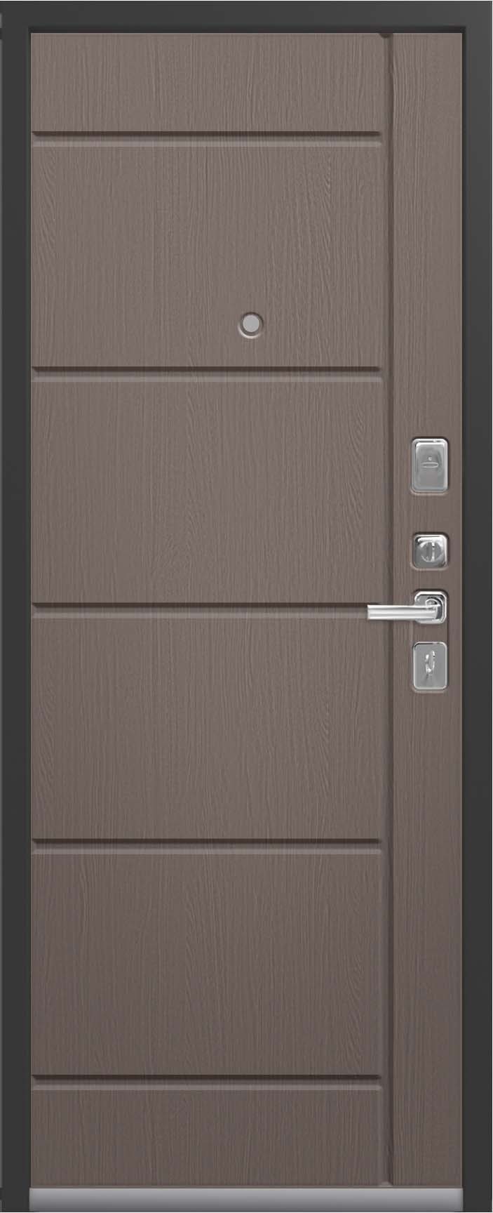 Внешнее исполнение: Металл (шоколад муар, черный муар) Внутреннее исполнение: МДФ 16 мм Цвет внутренней панели: миндаль, дуб полярный Толщина металла: 2.0 мм Толщина полотна: 120 мм Глубина короба: 175 мм Наполнение: Пеноплекс Терморазрыв: да Контур уплотнения: 1 магнитный + 2 Замки: - 2 сувальдных замка: Гардиан 20.01- 5 ригелей (под заказ: CISA) Эксцентрик (регулятор притвора): да Цилиндр (ключ-вертушка): нет Броненакладка на цилиндр: нет Накладка с автоматическими шторками под сувальдный ключ: да Ночная задвижка: да Ручка раздельная: да Глазок: нет Нержавеющий порог: да Монтажный уплотнитель AirTape: да Фольгированный утеплитель на коробе: нет Противосъемные штыри: да Петли: 3