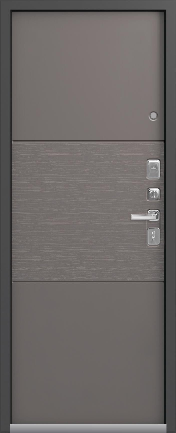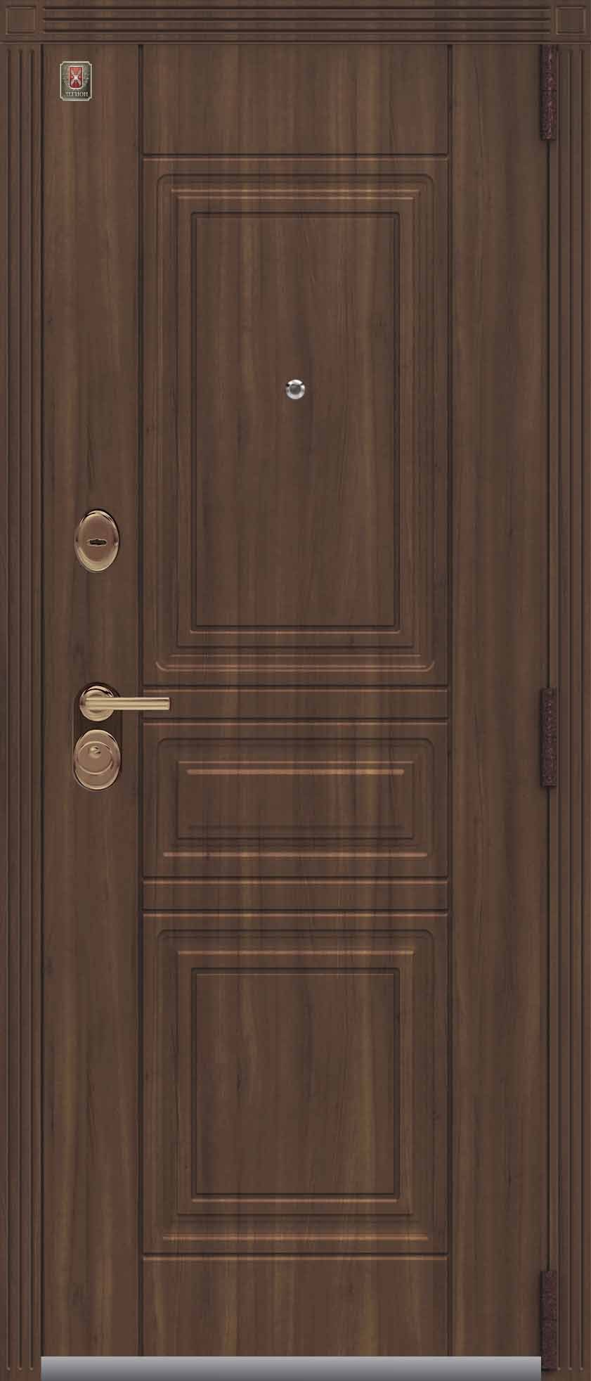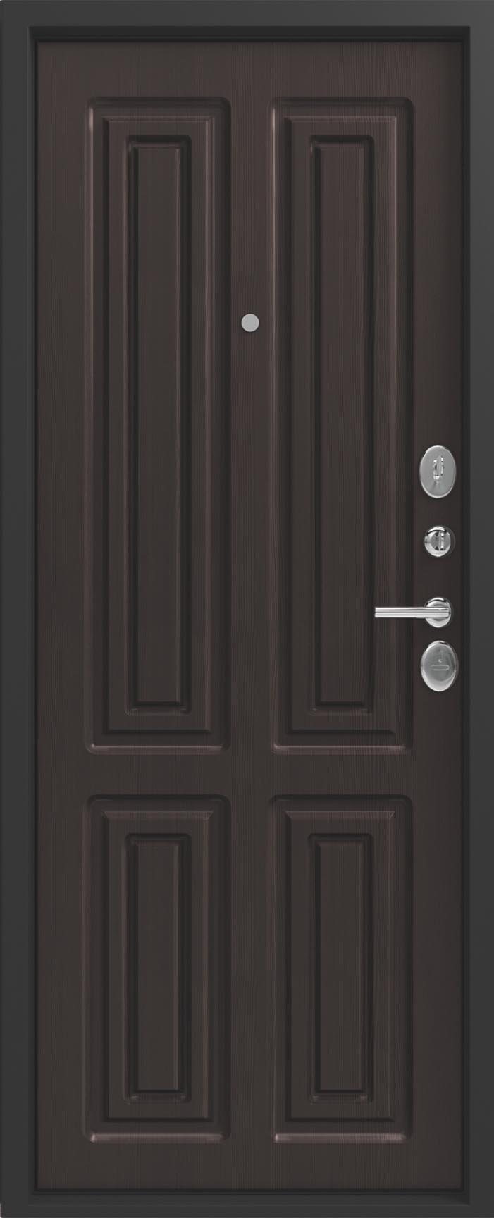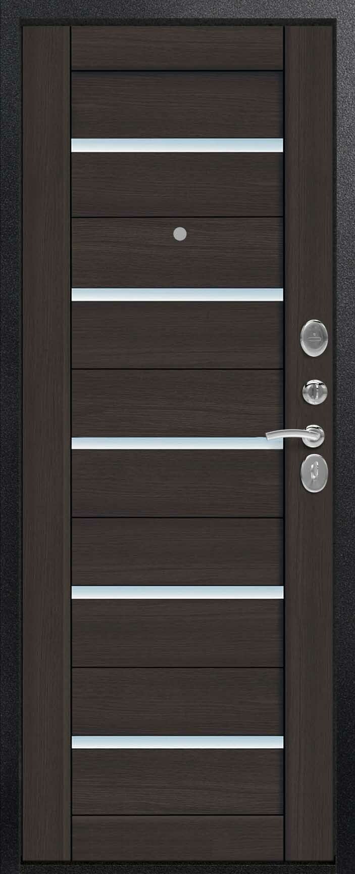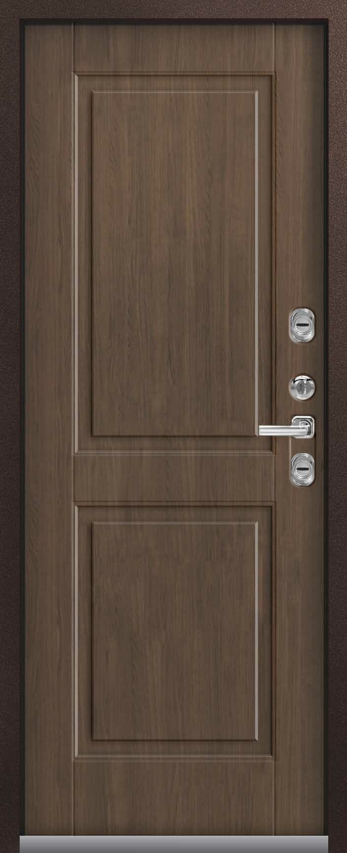 Внешнее исполнение: Металл (шоколад муар, черный муар) Внутреннее исполнение: МДФ 16 мм Цвет внутренней панели: миндаль, дуб полярный Толщина металла: 2.0 мм Толщина полотна: 120 мм Глубина короба: 175 мм Наполнение: Пеноплекс Терморазрыв: да Контур уплотнения: 1 магнитный + 2 Замки: - 2 сувальдных замка: Гардиан 20.01- 5 ригелей (под заказ: CISA) Эксцентрик (регулятор притвора): да Цилиндр (ключ-вертушка): нет Броненакладка на цилиндр: нет Накладка с автоматическими шторками под сувальдный ключ: да Ночная задвижка: да Ручка раздельная: да Глазок: нет Нержавеющий порог: да Монтажный уплотнитель AirTape: да Фольгированный утеплитель на коробе: нет Противосъемные штыри: да Петли: 3