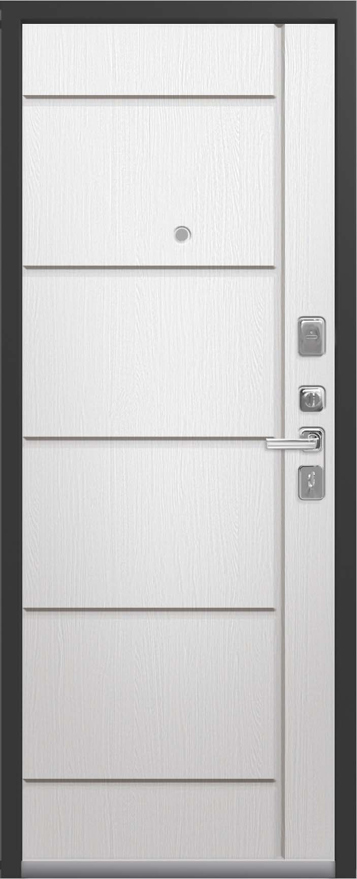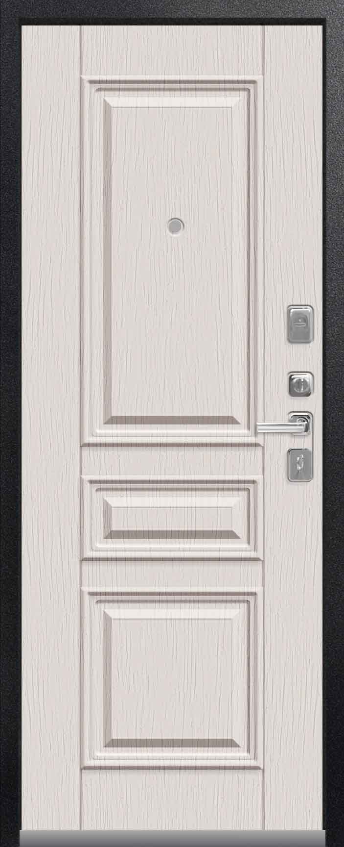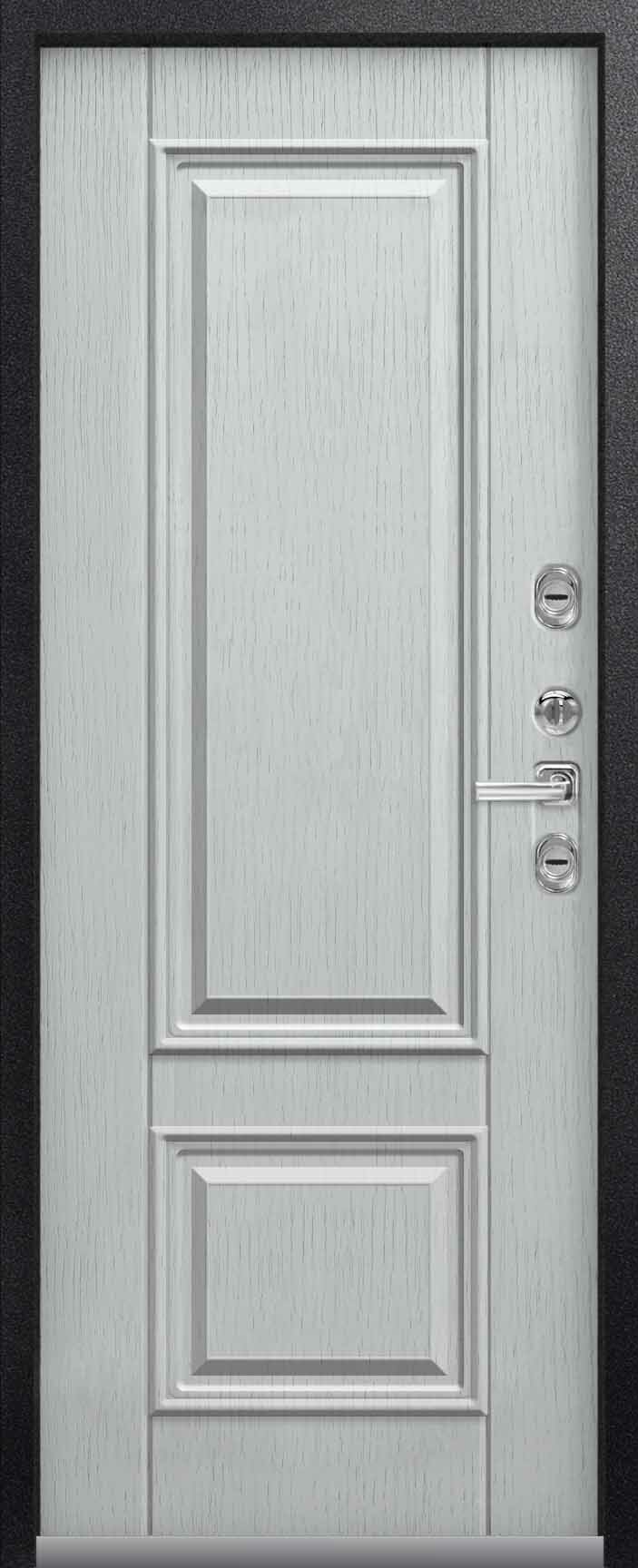 Внешнее исполнение: Металл (серый муар) Внутреннее исполнение: МДФ 16 мм Цвет внутренней панели: ясень пепельный, ясень скандинавский Толщина металла: 2.0 мм Толщина полотна: 110 мм Глубина короба: 165 мм Наполнение: Пенополистирол + мин. плита Терморазрыв: нет Контур уплотнения: 1 магнитный + 2 Замки: 2 замка: Гардиан 30.01, 32.11 (под заказ: CISA, KALE) Эксцентрик (регулятор притвора): да Цилиндр (ключ-вертушка): да Броненакладка на цилиндр: да Накладка с автоматическими шторками под сувальдный ключ: да Ночная задвижка: да Ручка раздельная: да Глазок: да Нержавеющий порог: да Монтажный уплотнитель AirTape: да Фольгированный утеплитель на коробе: нет Противосъемные штыри: да Петли: 3