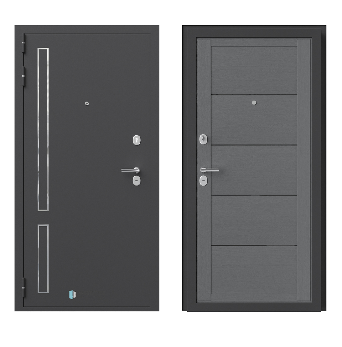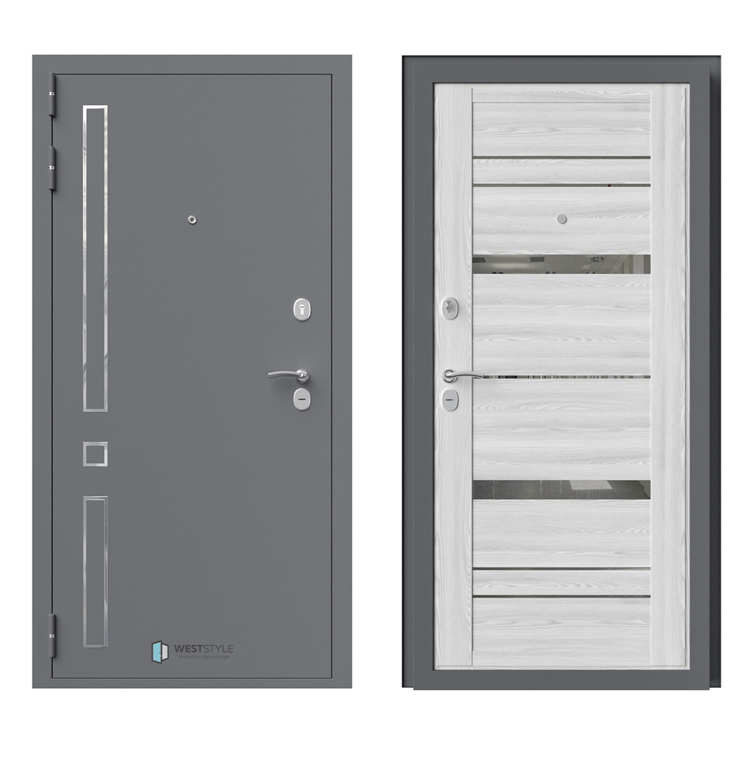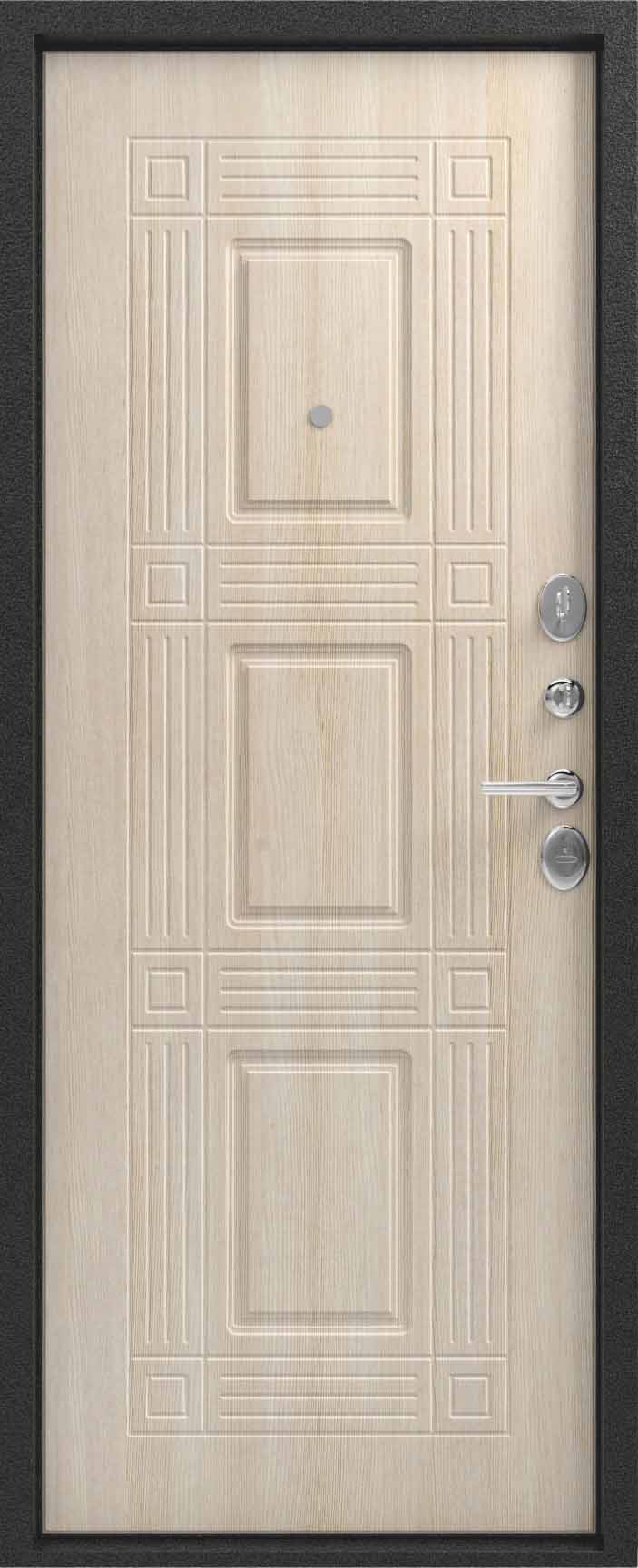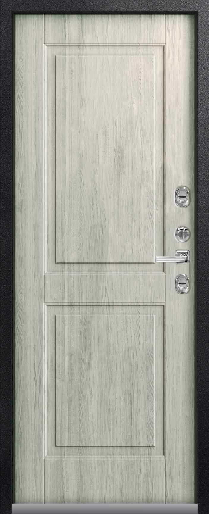 Внешнее исполнение: Металл (серый муар) Внутреннее исполнение: МДФ 16 мм Цвет внутренней панели: ясень пепельный, ясень скандинавский Толщина металла: 2.0 мм Толщина полотна: 110 мм Глубина короба: 165 мм Наполнение: Пенополистирол + мин. плита Терморазрыв: нет Контур уплотнения: 1 магнитный + 2 Замки: 2 замка: Гардиан 30.01, 32.11 (под заказ: CISA, KALE) Эксцентрик (регулятор притвора): да Цилиндр (ключ-вертушка): да Броненакладка на цилиндр: да Накладка с автоматическими шторками под сувальдный ключ: да Ночная задвижка: да Ручка раздельная: да Глазок: да Нержавеющий порог: да Монтажный уплотнитель AirTape: да Фольгированный утеплитель на коробе: нет Противосъемные штыри: да Петли: 3
