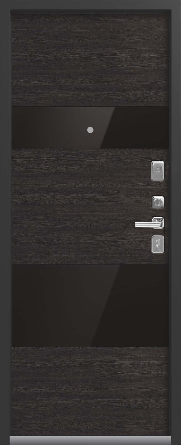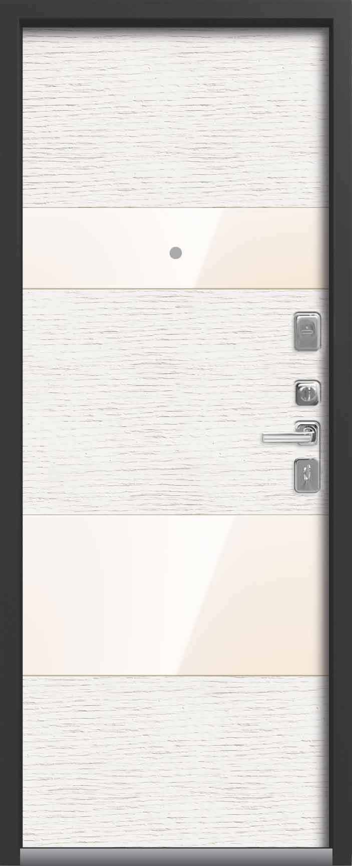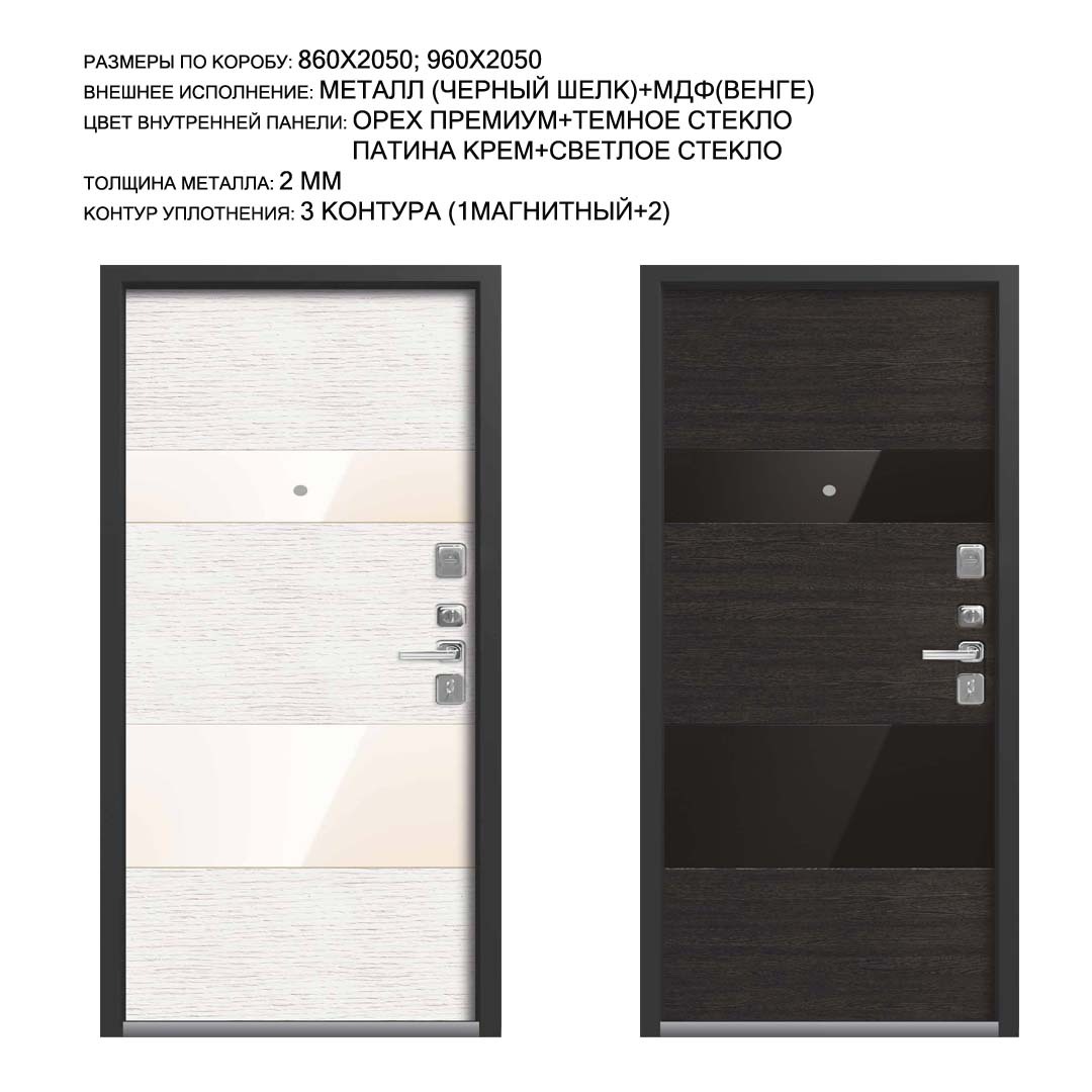 Внешнее исполнение: МДФ (черный скол дуба) + стекло Внутреннее исполнение: МДФ 16 мм Цвет внутренней панели: миндаль, полярный дуб Толщина металла: 2.0 мм Толщина полотна: 120 мм Глубина короба: 180 мм Наполнение: Пеноплекс + шумоизоляция «МЕГАСПАН» Терморазрыв: да Контур уплотнения: 1 магнитный + 2 Замки: 2 сувальдных замка: Гардиан 20.01 - 4 класс (под заказ: CISA) Эксцентрик (регулятор притвора): да Цилиндр (ключ-вертушка): нет Броненакладка на цилиндр: нет Накладка с автоматическими шторками под сувальдный ключ: да Ночная задвижка: да Ручка раздельная: да Глазок: нет Нержавеющий порог: да Монтажный уплотнитель AirTape: да Фольгированный утеплитель на коробе: да Противосъемные штыри: да Петли: 3 (Италия)