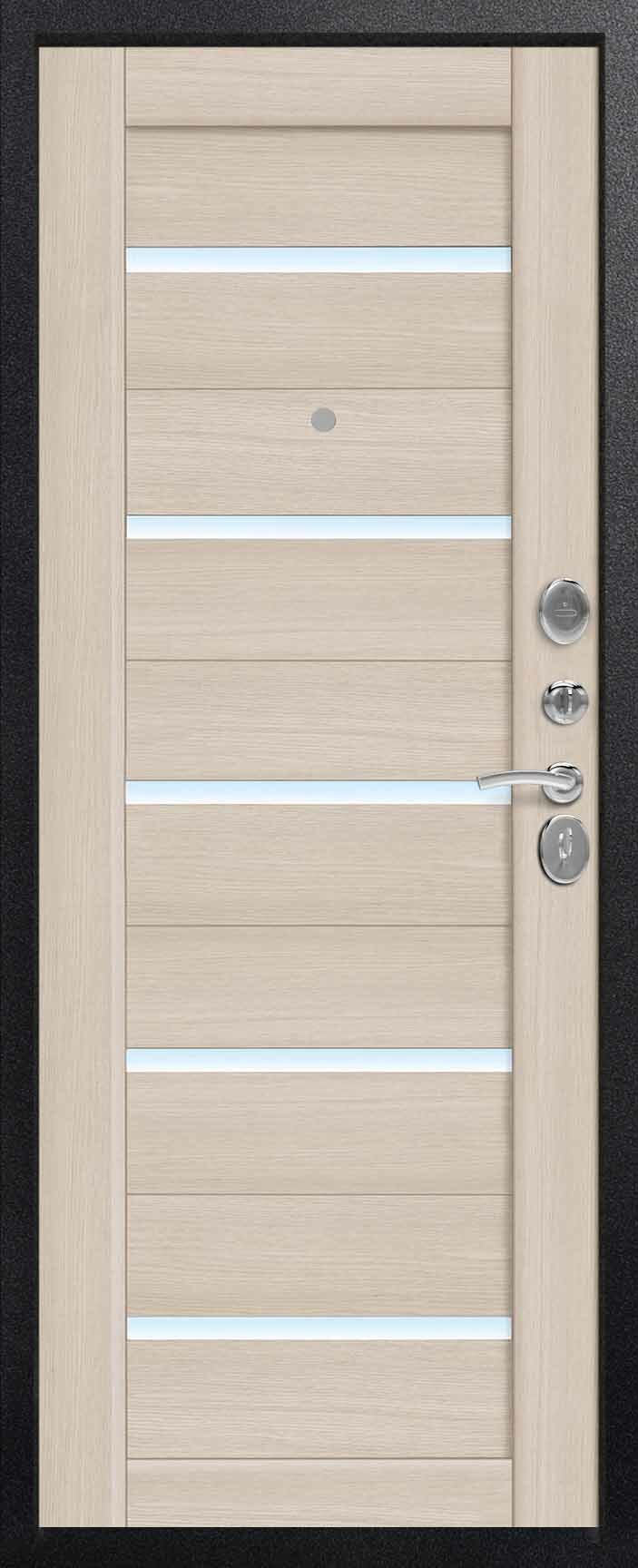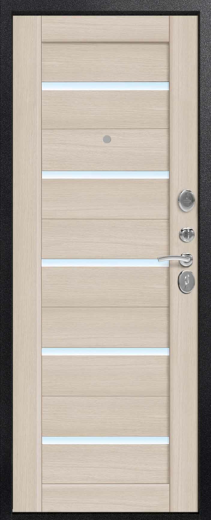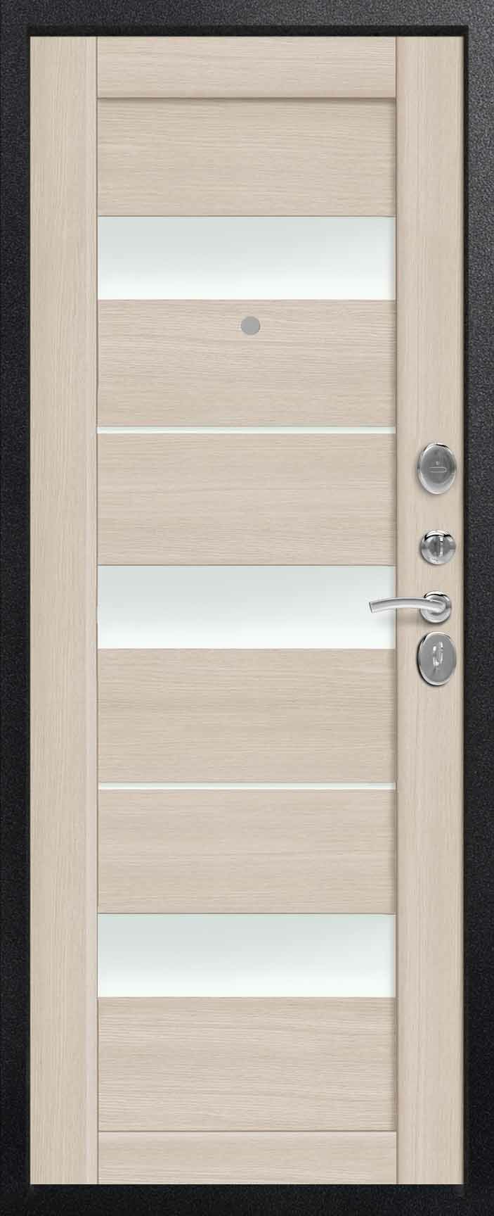 Внешнее исполнение: МДФ (черный скол дуба) + стекло Внутреннее исполнение: МДФ 16 мм Цвет внутренней панели: миндаль, полярный дуб Толщина металла: 2.0 мм Толщина полотна: 120 мм Глубина короба: 180 мм Наполнение: Пеноплекс + шумоизоляция «МЕГАСПАН» Терморазрыв: да Контур уплотнения: 1 магнитный + 2 Замки: 2 сувальдных замка: Гардиан 20.01 - 4 класс (под заказ: CISA) Эксцентрик (регулятор притвора): да Цилиндр (ключ-вертушка): нет Броненакладка на цилиндр: нет Накладка с автоматическими шторками под сувальдный ключ: да Ночная задвижка: да Ручка раздельная: да Глазок: нет Нержавеющий порог: да Монтажный уплотнитель AirTape: да Фольгированный утеплитель на коробе: да Противосъемные штыри: да Петли: 3 (Италия)