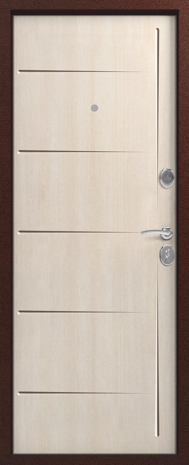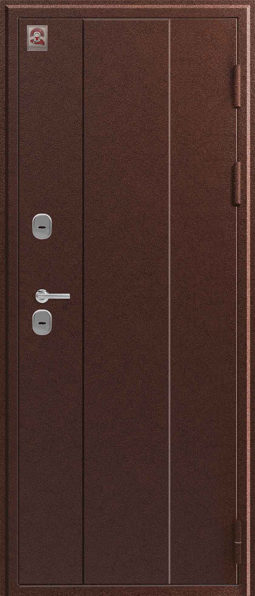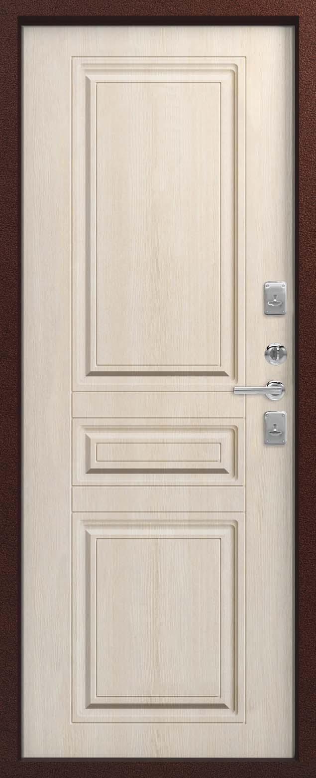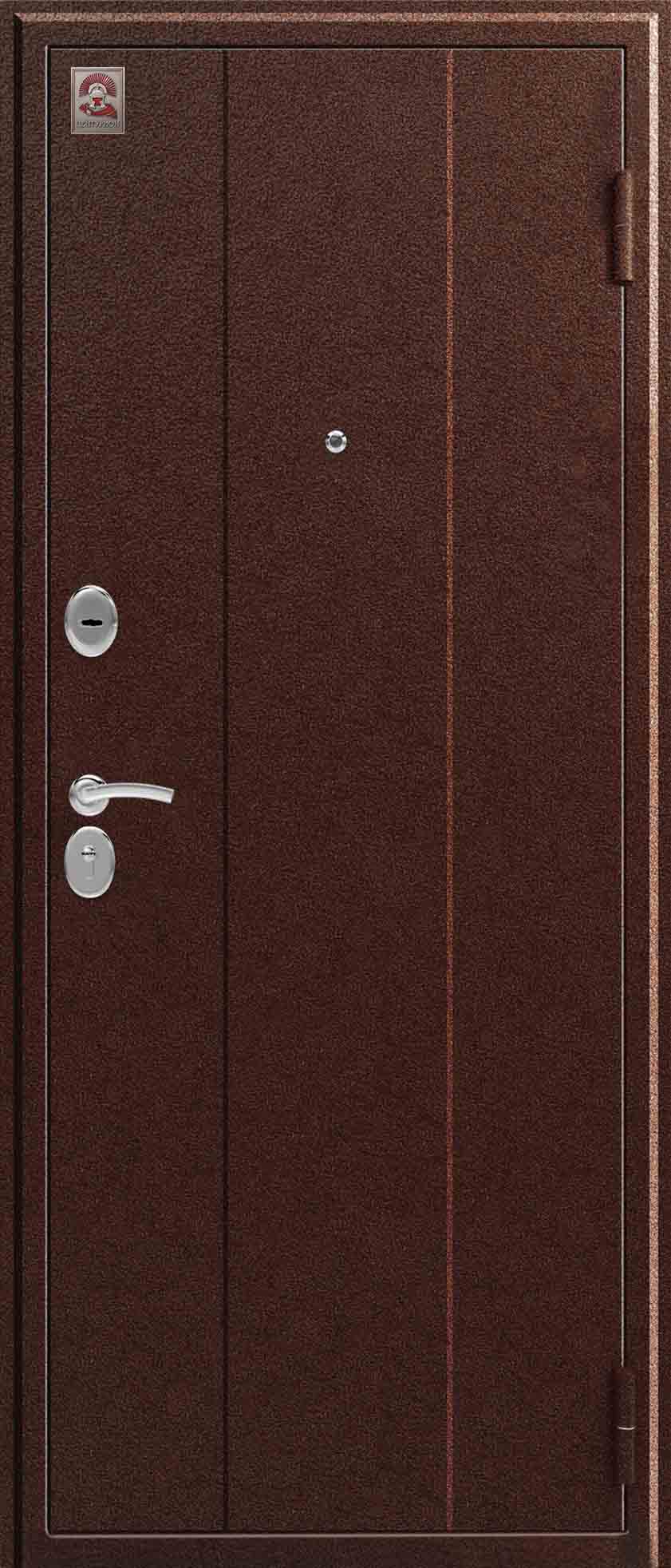 Внешнее исполнение: Металл (медный муар) Внутреннее исполнение: МДФ 10 мм Цвет внутренней панели: седой дуб, тиковое дерево Толщина металла: 1.2 мм Толщина полотна: 100 мм Глубина короба: 135 мм Наполнение: Пенополистирол Терморазрыв: да Контур уплотнения: 2 Замки: 2 сувальдных замка: Гардиан 10.11, 10.01 Эксцентрик (регулятор притвора): да Цилиндр (ключ-вертушка): нет Броненакладка на цилиндр: нет Накладка с автоматическими шторками под сувальдный ключ: да Ночная задвижка: да Ручка раздельная: да Глазок: нет Нержавеющий порог: нет Монтажный уплотнитель AirTape: нет Фольгированный утеплитель на коробе: нет Противосъемные штыри: да Петли: 3