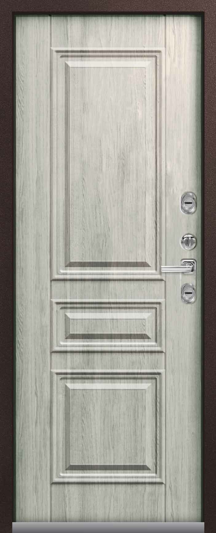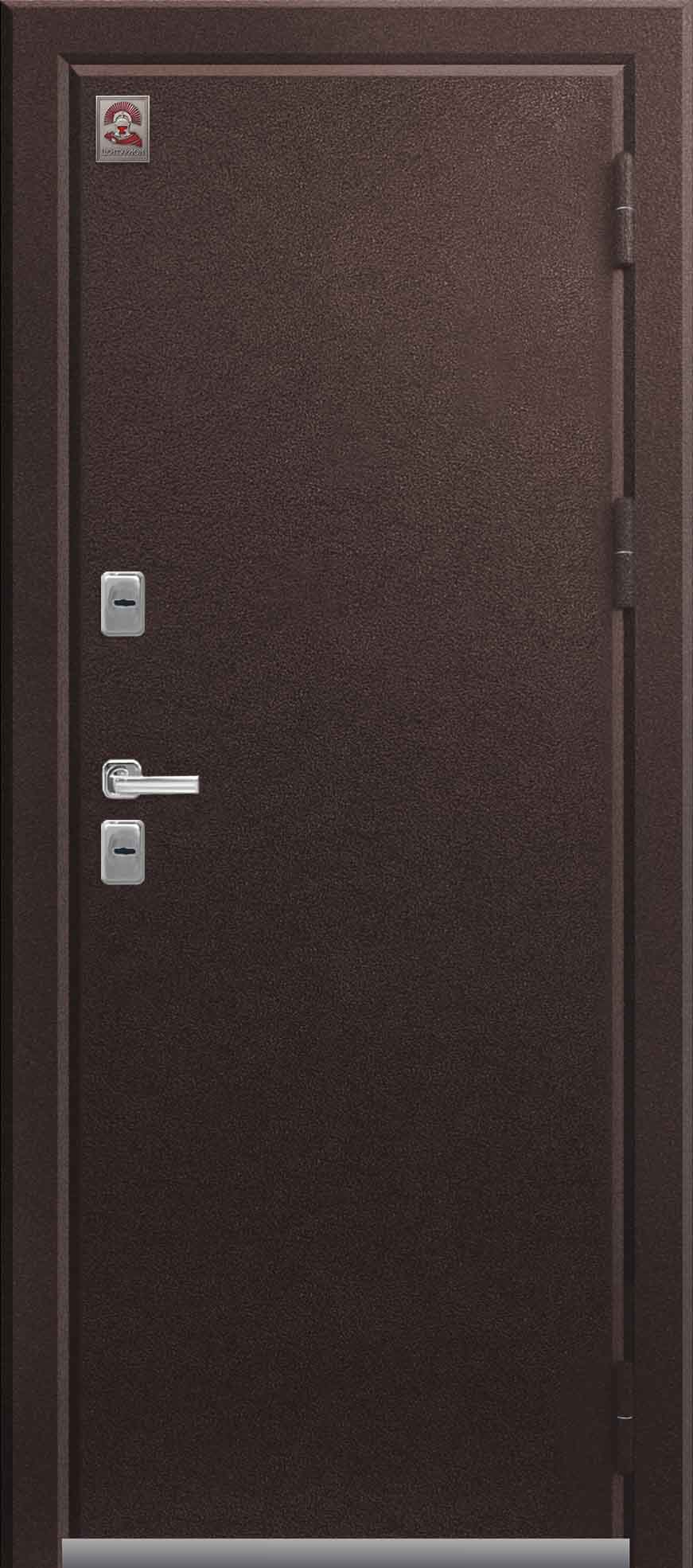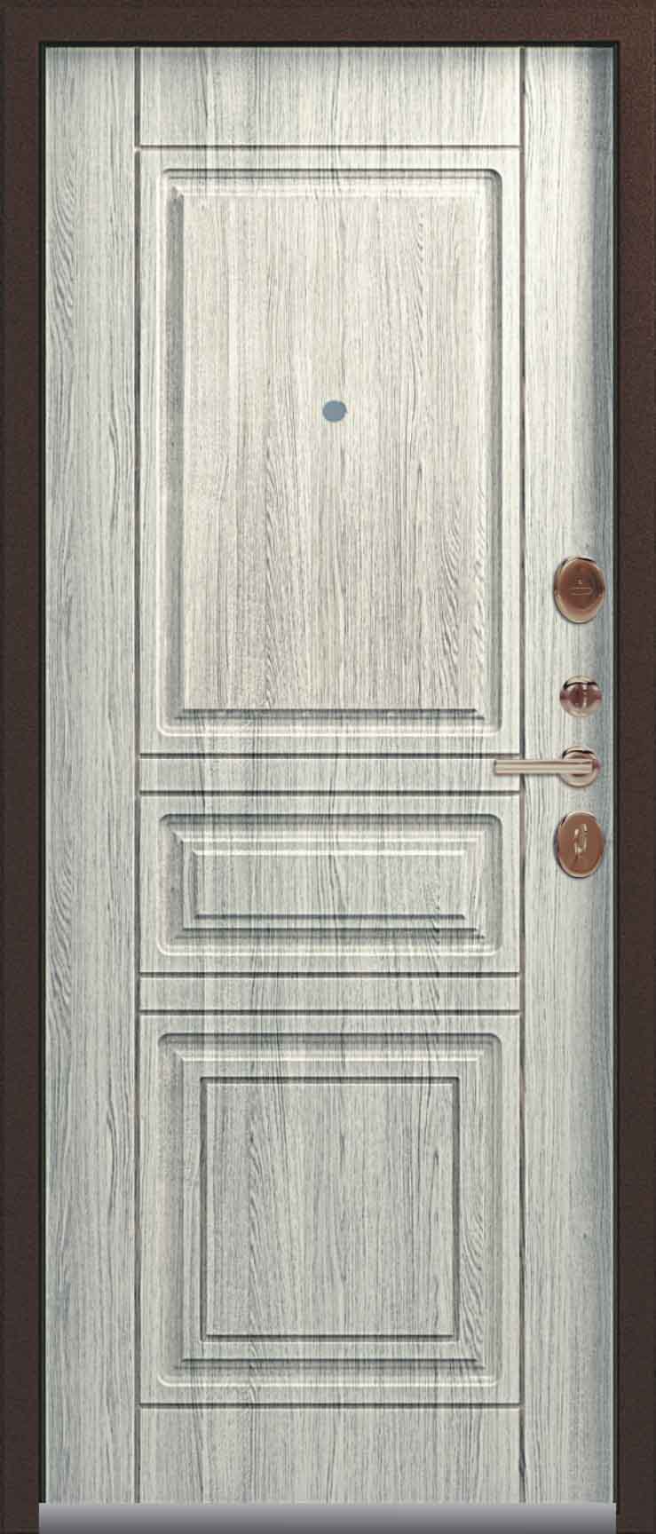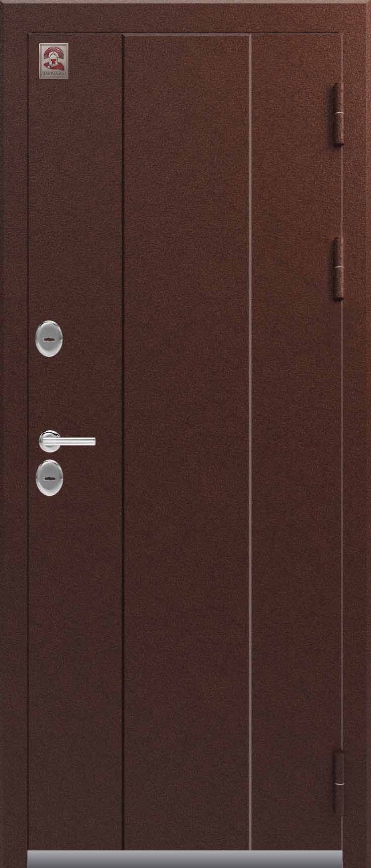 Внешнее исполнение: Металл (медный муар) Внутреннее исполнение: МДФ 10 мм Цвет внутренней панели: седой дуб, тиковое дерево Толщина металла: 1.2 мм Толщина полотна: 100 мм Глубина короба: 135 мм Наполнение: Пенополистирол Терморазрыв: да Контур уплотнения: 2 Замки: 2 сувальдных замка: Гардиан 10.11, 10.01 Эксцентрик (регулятор притвора): да Цилиндр (ключ-вертушка): нет Броненакладка на цилиндр: нет Накладка с автоматическими шторками под сувальдный ключ: да Ночная задвижка: да Ручка раздельная: да Глазок: нет Нержавеющий порог: нет Монтажный уплотнитель AirTape: нет Фольгированный утеплитель на коробе: нет Противосъемные штыри: да Петли: 3