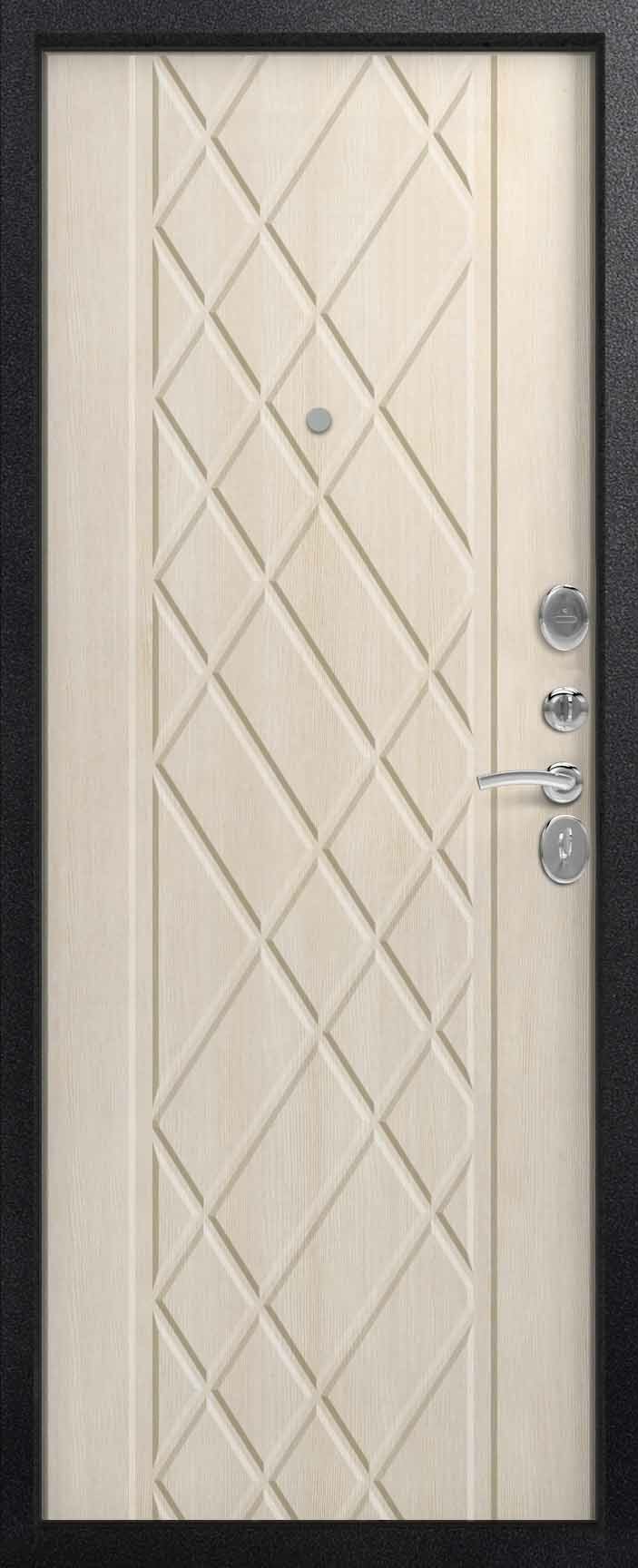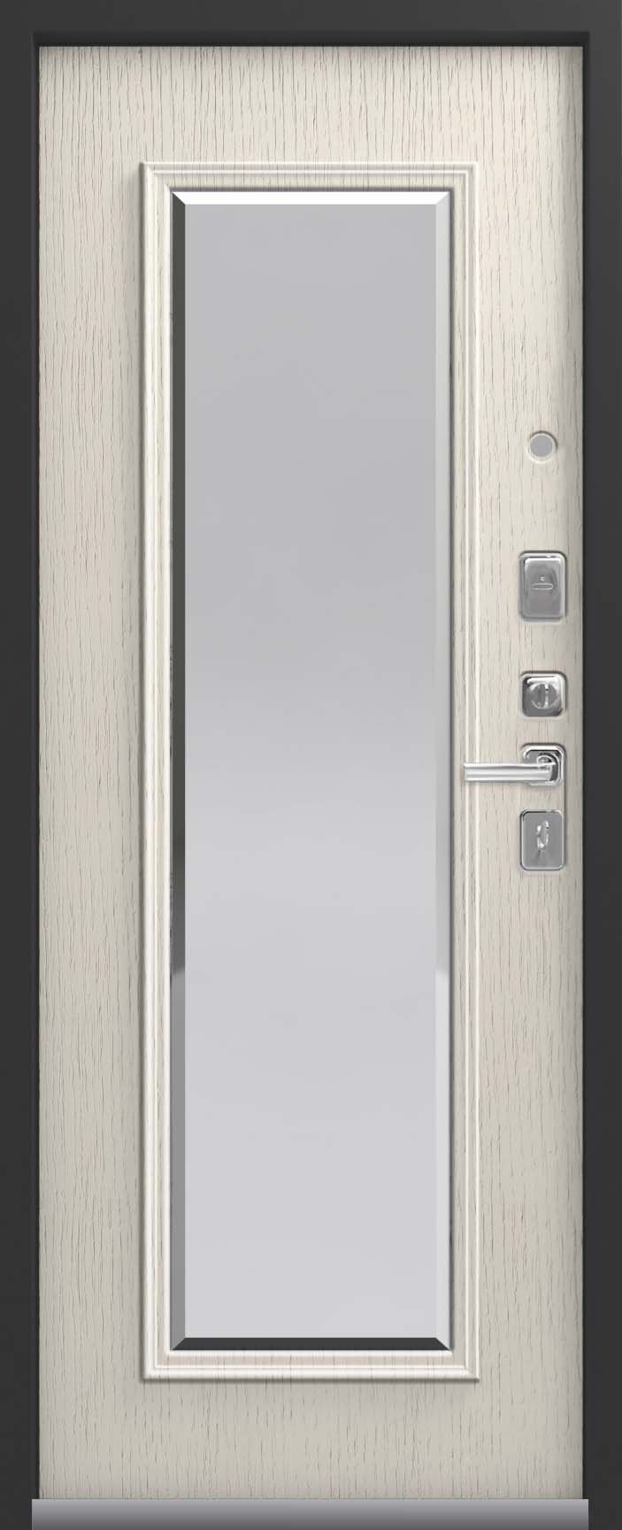 Внешнее исполнение: Металл (черный муар) Внутреннее исполнение: МДФ 16 мм + зеркало с фацетом 10 мм Цвет внутренней панели: миндаль, полярный дуб Толщина металла: 1.4 мм Толщина полотна: 100 мм Глубина короба: 125 мм Наполнение: Пенополистирол Терморазрыв: нет Контур уплотнения: 3 контура Замки: 2 замка: Гардиан 30.01, 32.11 Эксцентрик (регулятор притвора): да Цилиндр (ключ-вертушка): да Броненакладка на цилиндр: да Накладка с автоматическими шторками под сувальдный ключ: нет Ночная задвижка: да Ручка раздельная: да Глазок: да Нержавеющий порог: нет Монтажный уплотнитель AirTape: нет Фольгированный утеплитель на коробе: нет Противосъемные штыри: да Петли: 3