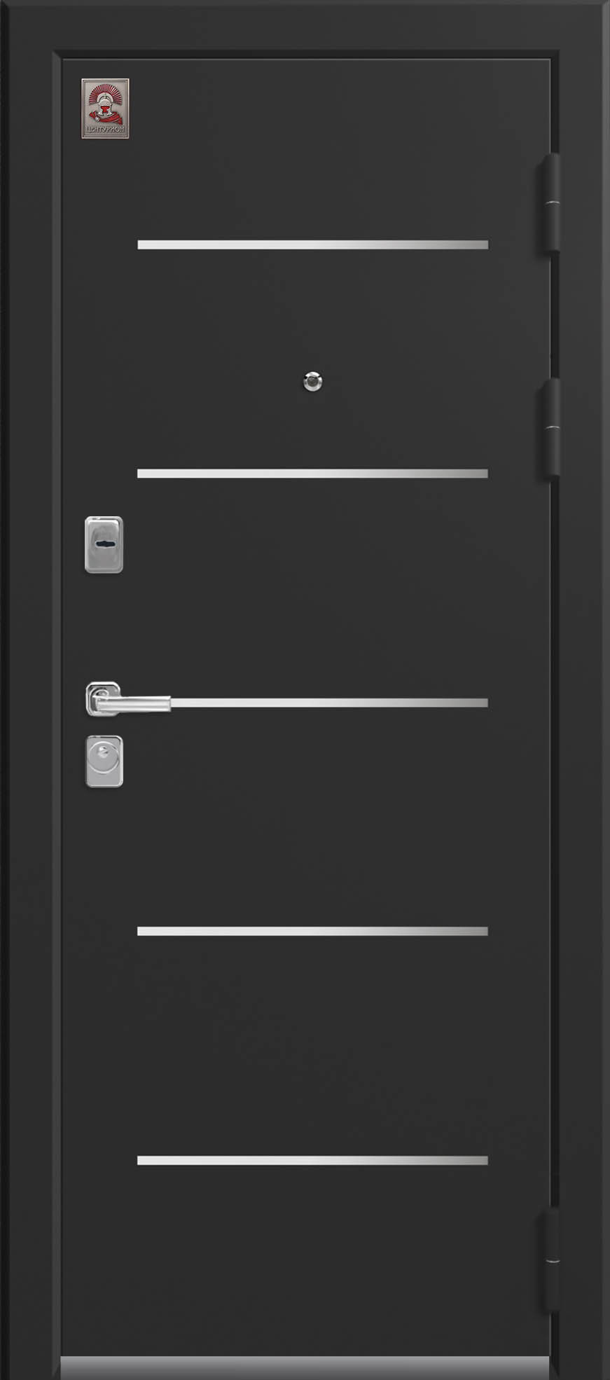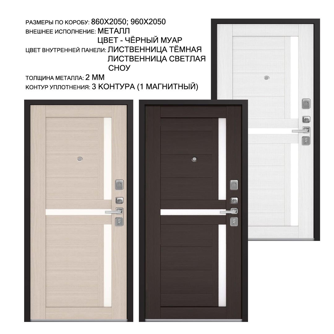 Внешнее исполнение: Металл (черный муар) с молдингом Внутреннее исполнение: царговый щит 22мм со стеклом Цвет внутренней панели: лиственница темная, лиственница светлая, сноу Толщина металла: 2.0 мм Толщина полотна: 110 мм Глубина короба: 150 мм Наполнение: Пенополистирол + мин. плита Терморазрыв: нет Контур уплотнения: 1 магнитный + 2 Замки: 2 замка: Гардиан 30.01, 32.11 (под заказ: CISA, KALE) Эксцентрик (регулятор притвора): да Цилиндр (ключ-вертушка): да Броненакладка на цилиндр: да Накладка с автоматическими шторками под сувальдный ключ: да Ночная задвижка: да Ручка раздельная: да Глазок: да Нержавеющий порог: да Монтажный уплотнитель AirTape: да Фольгированный утеплитель на коробе: нет Противосъемные штыри: да Петли: 3