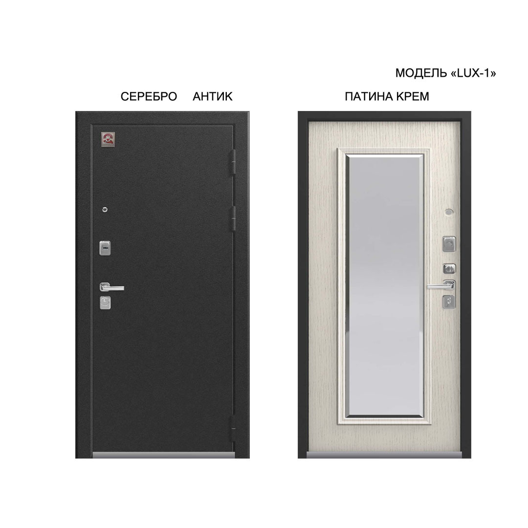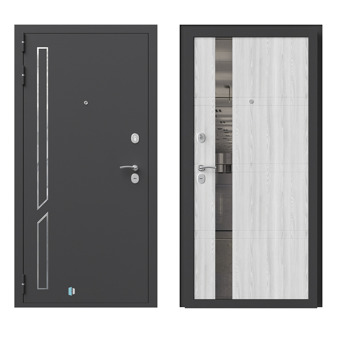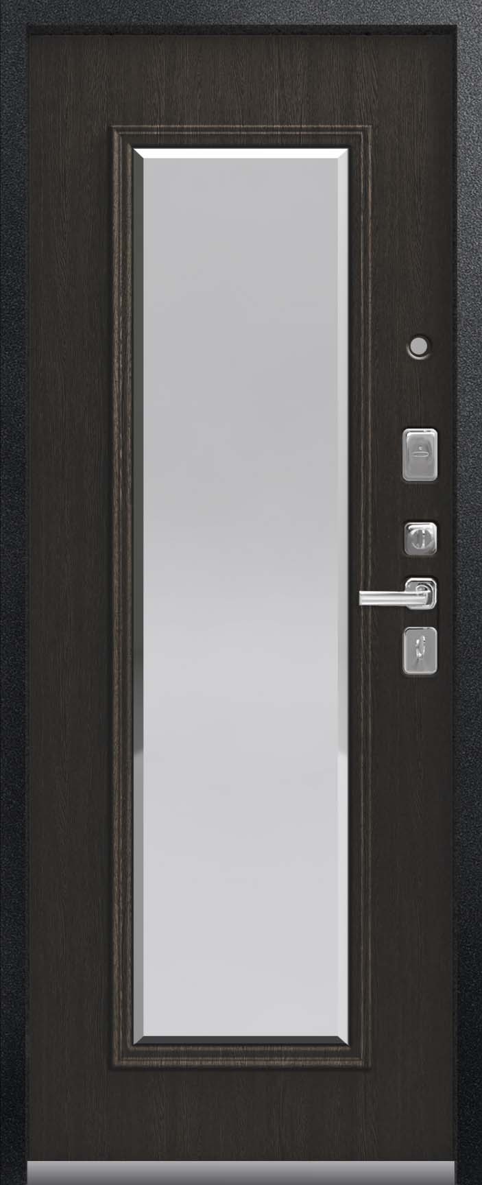 Внешнее исполнение: Металл (черный муар, серебро антик) Внутреннее исполнение: МДФ 16 мм + зеркало с фацетом 20 мм Цвет внутренней панели: орех премиум, патина крем Толщина металла: 2.0 мм Толщина полотна: 110 мм Глубина короба: 160 мм Наполнение: Пенополистирол + мин. плита Терморазрыв: нет Контур уплотнения: 1 магнитный + 2 Замки: 2 замка: Гардиан 30.01, 32.11 (под заказ: CISA, KALE) Эксцентрик (регулятор притвора): да Цилиндр (ключ-вертушка): да Броненакладка на цилиндр: да Накладка с автоматическими шторками под сувальдный ключ: да Ночная задвижка: да Ручка раздельная: да Глазок: да Нержавеющий порог: да Монтажный уплотнитель AirTape: да Фольгированный утеплитель на коробе: нет Противосъемные штыри: да Петли: 3