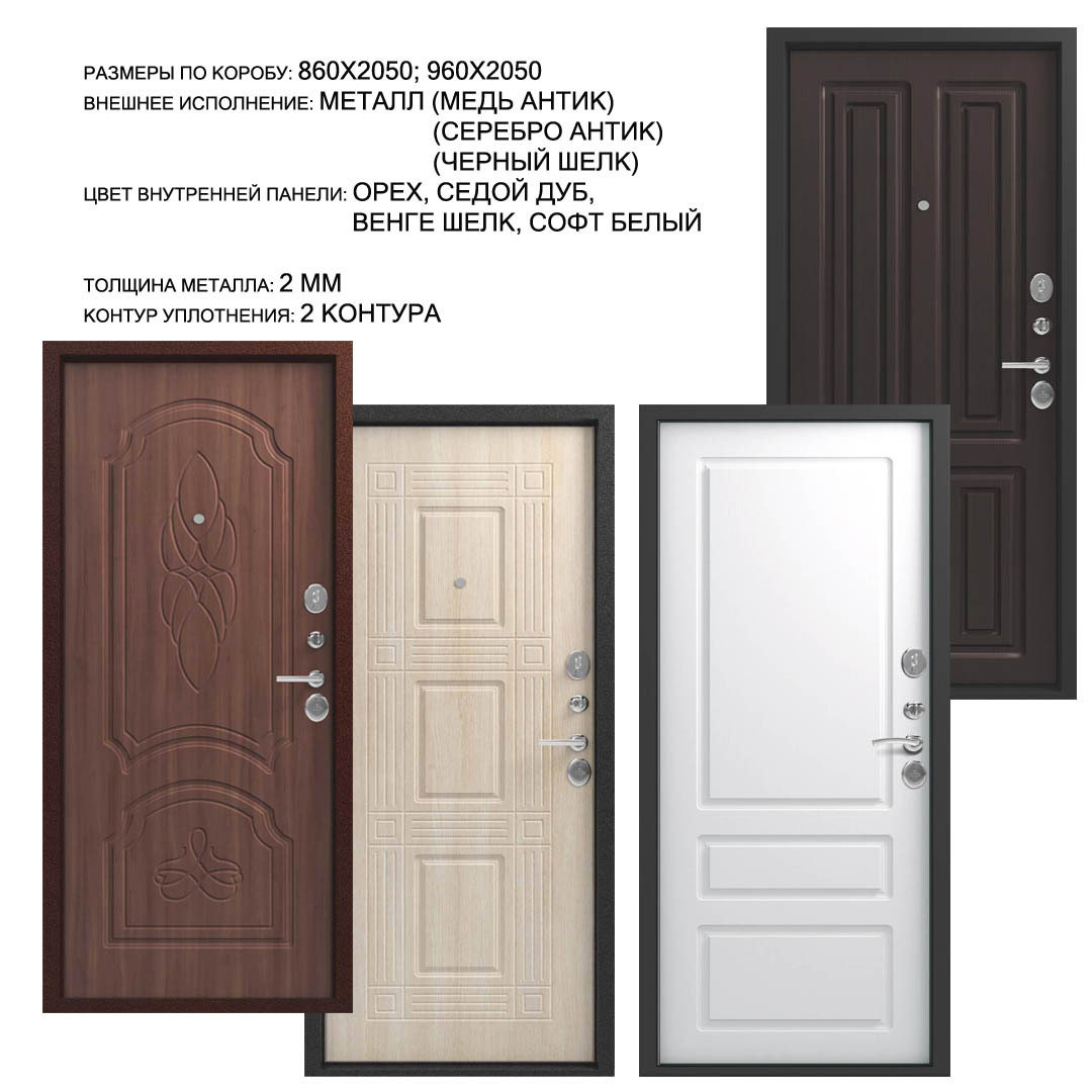 Внешнее исполнение: Металл (медь антик, серебро антик, черный шелк) Внутреннее исполнение: МДФ 16 мм Цвет внутренней панели: орех, седой дуб, венге шелк, софт белый Толщина металла: 2.0 мм Толщина полотна: 110 мм Глубина короба: 150 мм Наполнение: Пенополистирол + мин. плита Терморазрыв: нет Контур уплотнения: 2 контура Замки: 2 замка: Гардиан 32.01, 30.15 (под заказ: CISA, KALE) Эксцентрик (регулятор притвора): да Цилиндр (ключ-вертушка): да Броненакладка на цилиндр: да Накладка с автоматическими шторками под сувальдный ключ: нет Ночная задвижка: да Ручка раздельная: да Глазок: да Нержавеющий порог: нет Монтажный уплотнитель AirTape: да Фольгированный утеплитель на коробе: нет Противосъемные штыри: да Петли: 3
