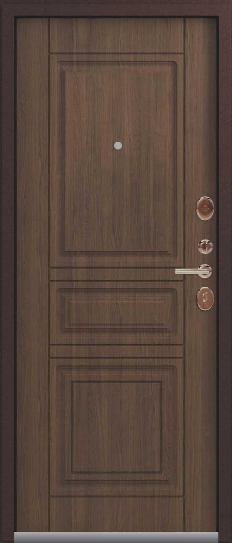 Внешнее исполнение: Металл (медь антик) Внутреннее исполнение: МДФ 11 мм Цвет внутренней панели: венге, седой дуб Толщина металла: 1.0 мм Толщина полотна: 85 мм Глубина короба: 120 мм Наполнение: Пенополистирол Терморазрыв: нет Контур уплотнения: 2 контура Замки: 2 замка: GALEON 816, 817 Эксцентрик (регулятор притвора): да Цилиндр (ключ-вертушка): да Броненакладка на цилиндр: нет Накладка с автоматическими шторками под сувальдный ключ: нет Ночная задвижка: нет Ручка раздельная: да Глазок: да Нержавеющий порог: нет Монтажный уплотнитель AirTape: нет Фольгированный утеплитель на коробе: нет Противосъемные штыри: да Петли: 2