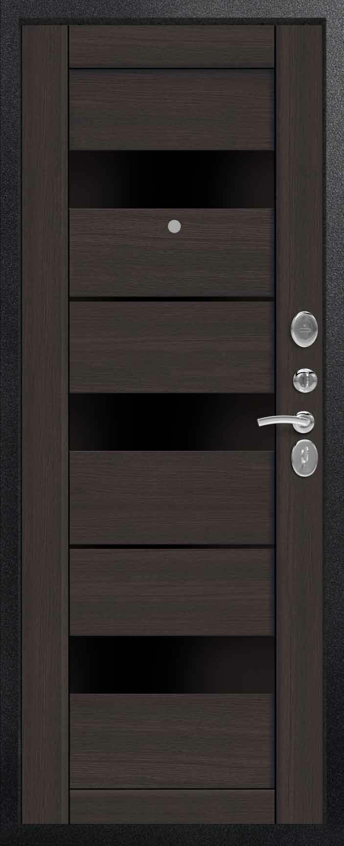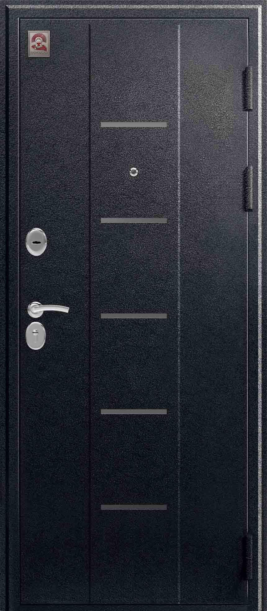 Внешнее исполнение: Металл (черный муар) Внутреннее исполнение: царговый щит 16 мм со стеклом (Х7 "ВЕНА", Х23 "ПРАГА") Цвет внутренней панели: лиственница темная, лиственница светлая Толщина металла: 1.4 мм Толщина полотна: 100 мм Глубина короба: 125 мм Наполнение: Пенополистирол Терморазрыв: нет Контур уплотнения: 3 контура Замки: Гардиан 30.01, 32.11 Эксцентрик (регулятор притвора): да Цилиндр (ключ-вертушка): да Броненакладка на цилиндр: да Накладка с автоматическими шторками под сувальдный ключ: нет Ночная задвижка: да Ручка раздельная: да Глазок: да Нержавеющий порог: нет Монтажный уплотнитель AirTape: нет Фольгированный утеплитель на коробе: нет Противосъемные штыри: да Петли: 3