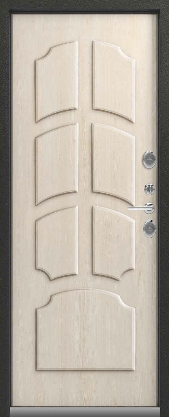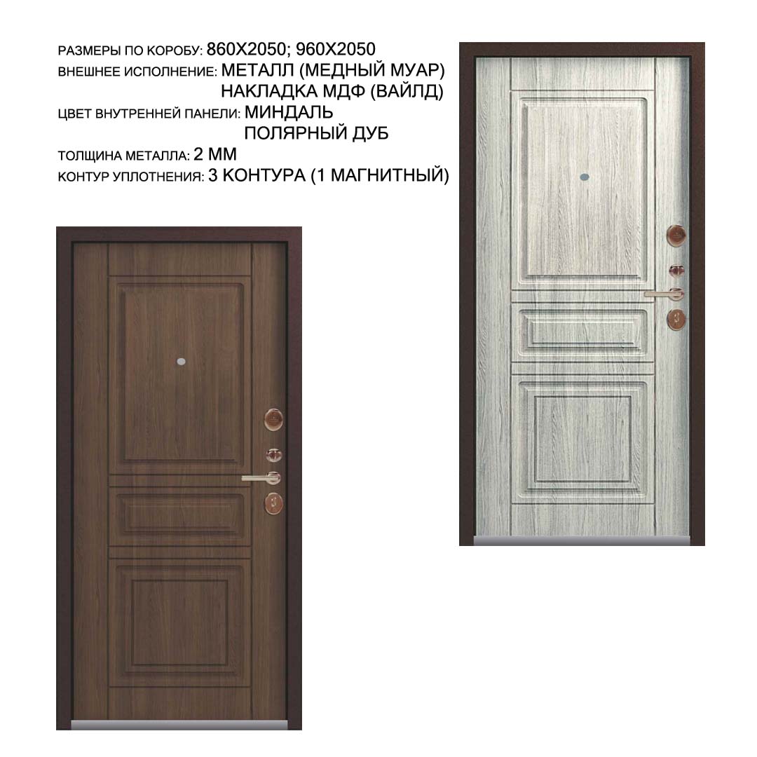 Внешнее исполнение: МДФ 16 мм (вайлд) Внутреннее исполнение: МДФ 16 мм Цвет внутренней панели: миндаль, полярный дуб Толщина металла: 2.0 мм Толщина полотна: 115 мм Глубина короба: 160 мм Наполнение: - Пенополистирол + мин. плита Терморазрыв: нет Контур уплотнения: 1 магнитный + 2 Замки: 2 замка: Гардиан 30.01, 32.11 (под заказ: CISA, KALE) Эксцентрик (регулятор притвора): да Цилиндр (ключ-вертушка): да Броненакладка на цилиндр: да Накладка с автоматическими шторками под сувальдный ключ: да Ночная задвижка: да Ручка раздельная: да Глазок: да Нержавеющий порог: да Монтажный уплотнитель AirTape: да Фольгированный утеплитель на коробе: нет Противосъемные штыри: да Петли: 3