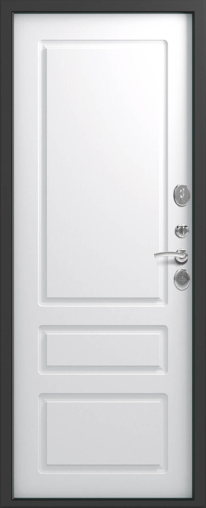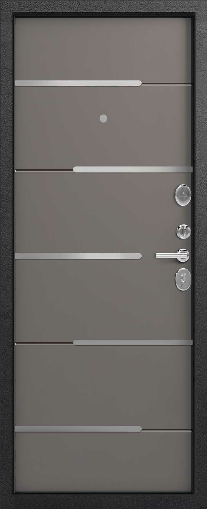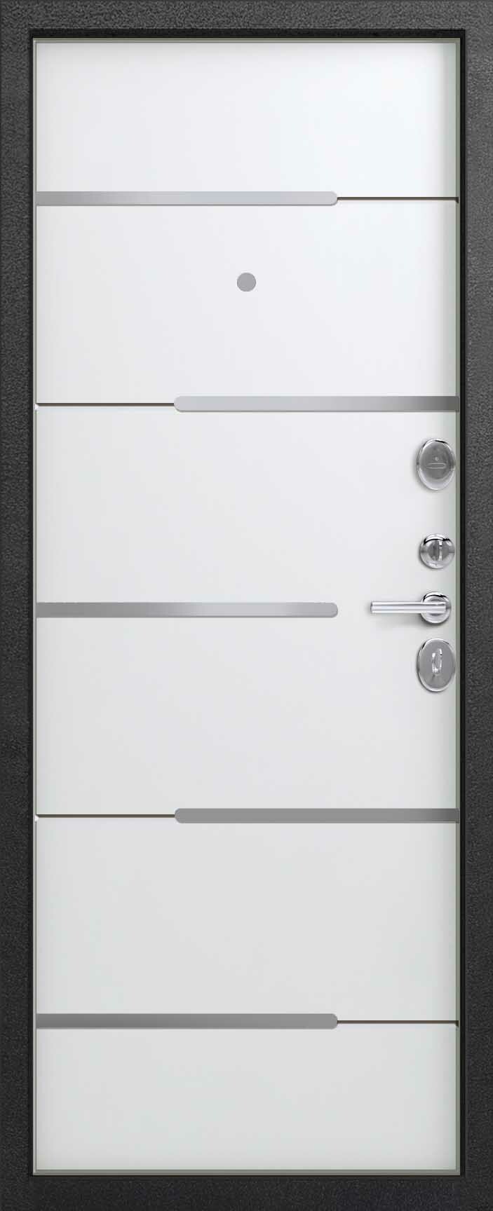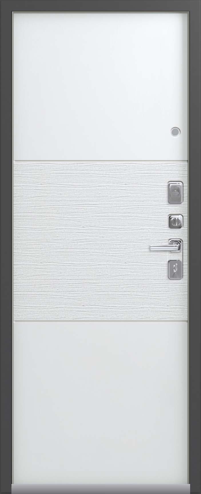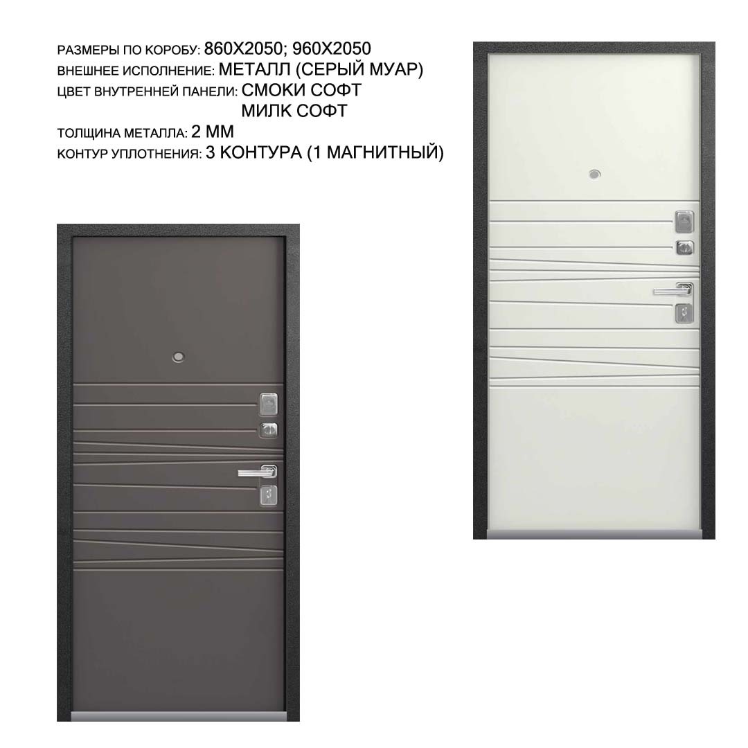 Внешнее исполнение: Металл (серый муар) Внутреннее исполнение: МДФ 16 мм с молдингом Цвет внутренней панели: софт серый, софт белый Толщина металла: 1.4 мм Толщина полотна: 100 мм Глубина короба: 125 мм Наполнение: Пенополистирол Терморазрыв: нет Контур уплотнения: 3 контура Замки: 2 замка: Гардиан 30.01, 32.11 Эксцентрик (регулятор притвора): да Цилиндр (ключ-вертушка): да Броненакладка на цилиндр: да Накладка с автоматическими шторками под сувальдный ключ: нет Ночная задвижка: да Ручка раздельная: да Глазок: да Нержавеющий порог: нет Монтажный уплотнитель AirTape: нет Фольгированный утеплитель на коробе: нет Противосъемные штыри: да Петли: 3