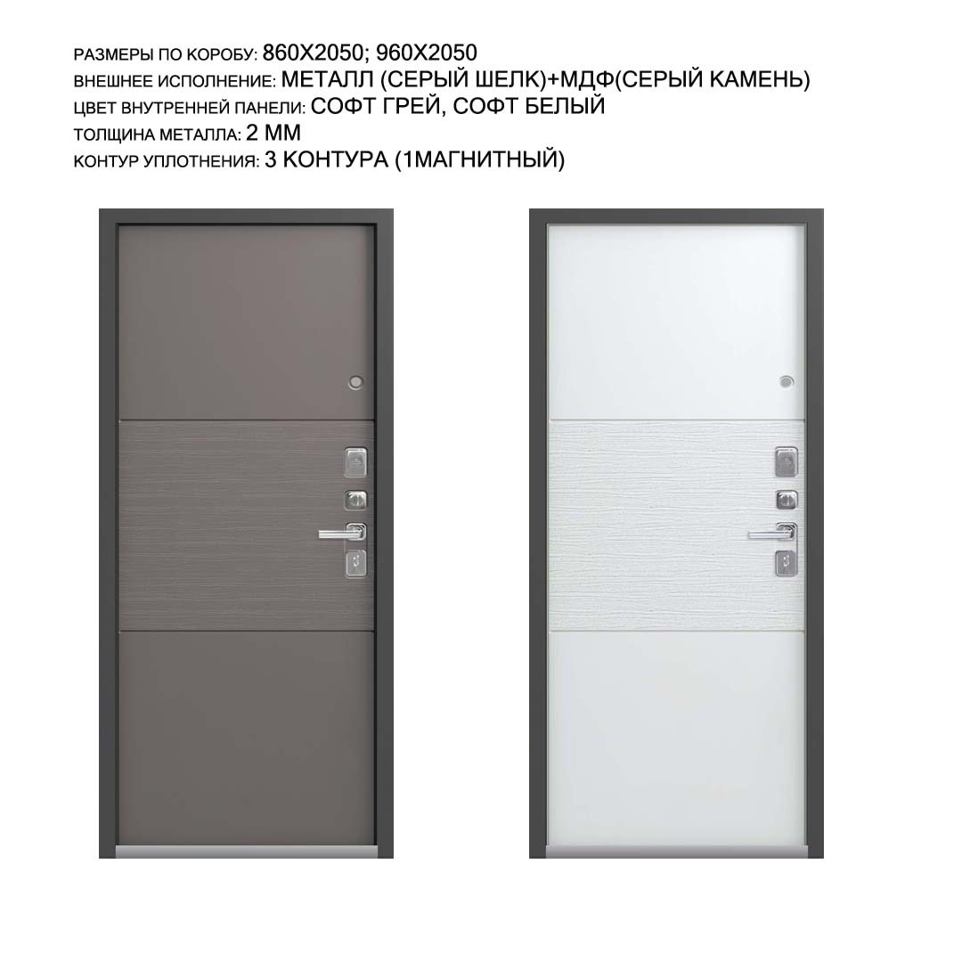 Внешнее исполнение: Металл (серый шелк) + ЛДСП 8мм (серый камень) Внутреннее исполнение: МДФ 16 мм Цвет внутренней панели: "софт-тач" софт серый, софт белый Толщина металла: 2.0 мм Толщина полотна: 110 мм Глубина короба: 160 мм Наполнение: Пенополистирол + мин. плита Терморазрыв: нет Контур уплотнения: 1 магнитный + 2 Замки: 2 замка: Гардиан 30.01, 32.11 (под заказ: CISA, KALE) Эксцентрик (регулятор притвора): да Цилиндр (ключ-вертушка): да Броненакладка на цилиндр: да Накладка с автоматическими шторками под сувальдный ключ: да Ночная задвижка: да Ручка раздельная: да Глазок: да Нержавеющий порог: да Монтажный уплотнитель AirTape: да Фольгированный утеплитель на коробе: нет Противосъемные штыри: да Петли: 3