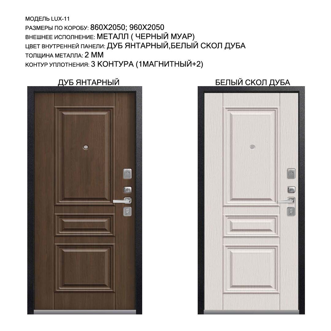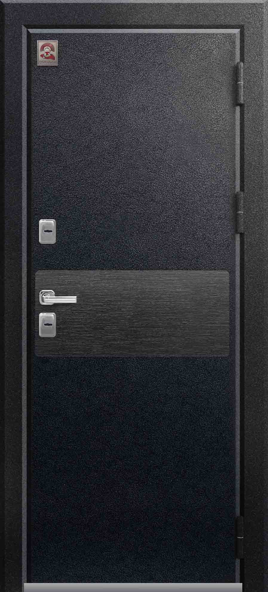 Внешнее исполнение: Металл (черный муар) Внутреннее исполнение: МДФ 16 мм Цвет внутренней панели: дуб мэлвил, белый скол дуба Толщина металла: 2.0 мм Толщина полотна: 110 мм Глубина короба: 165 мм Наполнение: Пенополистирол + мин. плита Терморазрыв: нет Контур уплотнения: 1 магнитный + 2 Замки: 2 замка: 4 класс - Гардиан 20.01, 22.11 (под заказ: CISA, KALE) Эксцентрик (регулятор притвора): да Цилиндр (ключ-вертушка): да Броненакладка на цилиндр: да Накладка с автоматическими шторками под сувальдный ключ: да Ночная задвижка: да Ручка раздельная: да Глазок: да Нержавеющий порог: да Монтажный уплотнитель AirTape: да Фольгированный утеплитель на коробе: нет Противосъемные штыри: да Петли: 3